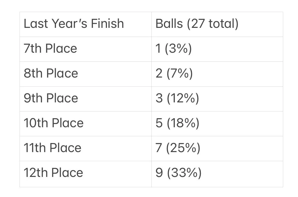 Those that missed the playoffs, their final place finish will be based off of regular season record and draft order will be done NBA lottery style. PingPong Balls will be randomly drawn in ascending pick order. With teams awarded an amount of balls based on where they finished.